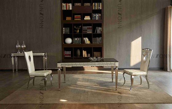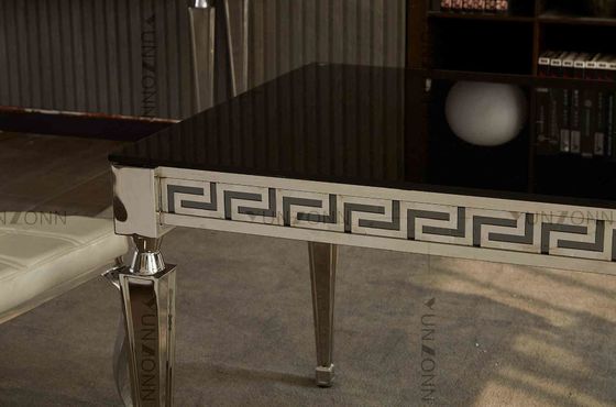 โต๊ะกระจกสีดำแบบกระชับพร้อมขอบแกะสลักและขาเชิงมุมสำหรับห้องรับประทานอาหาร